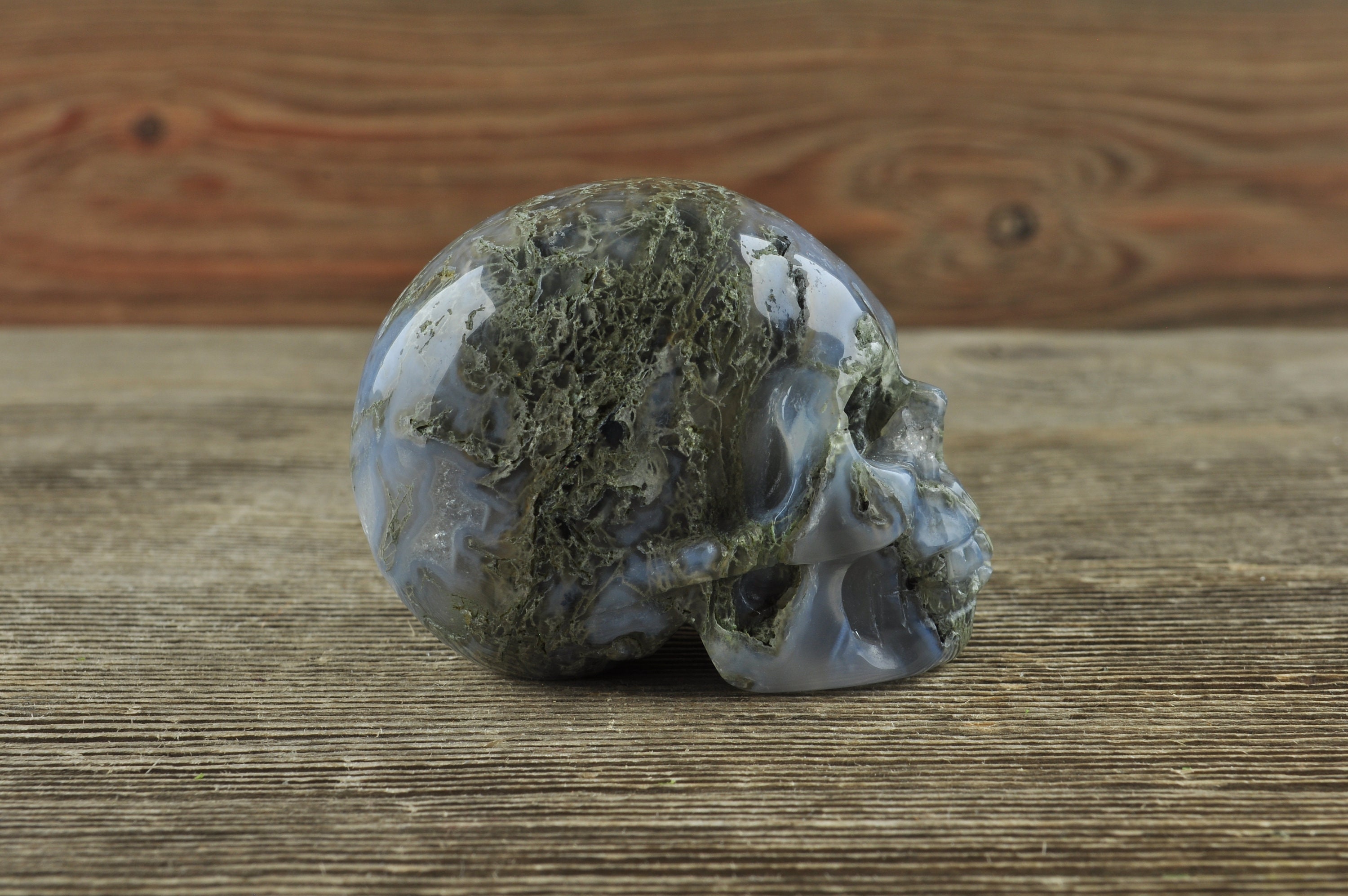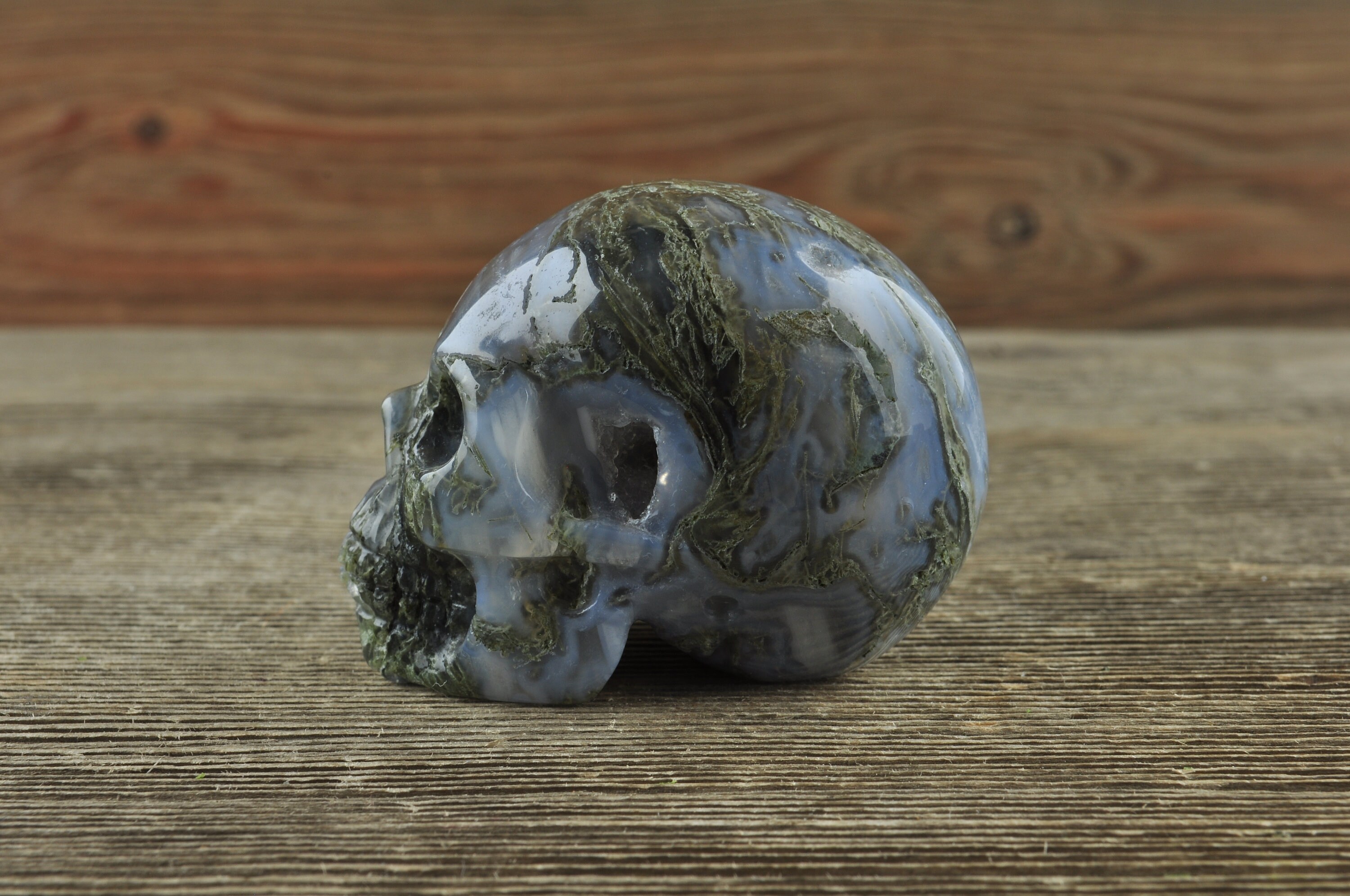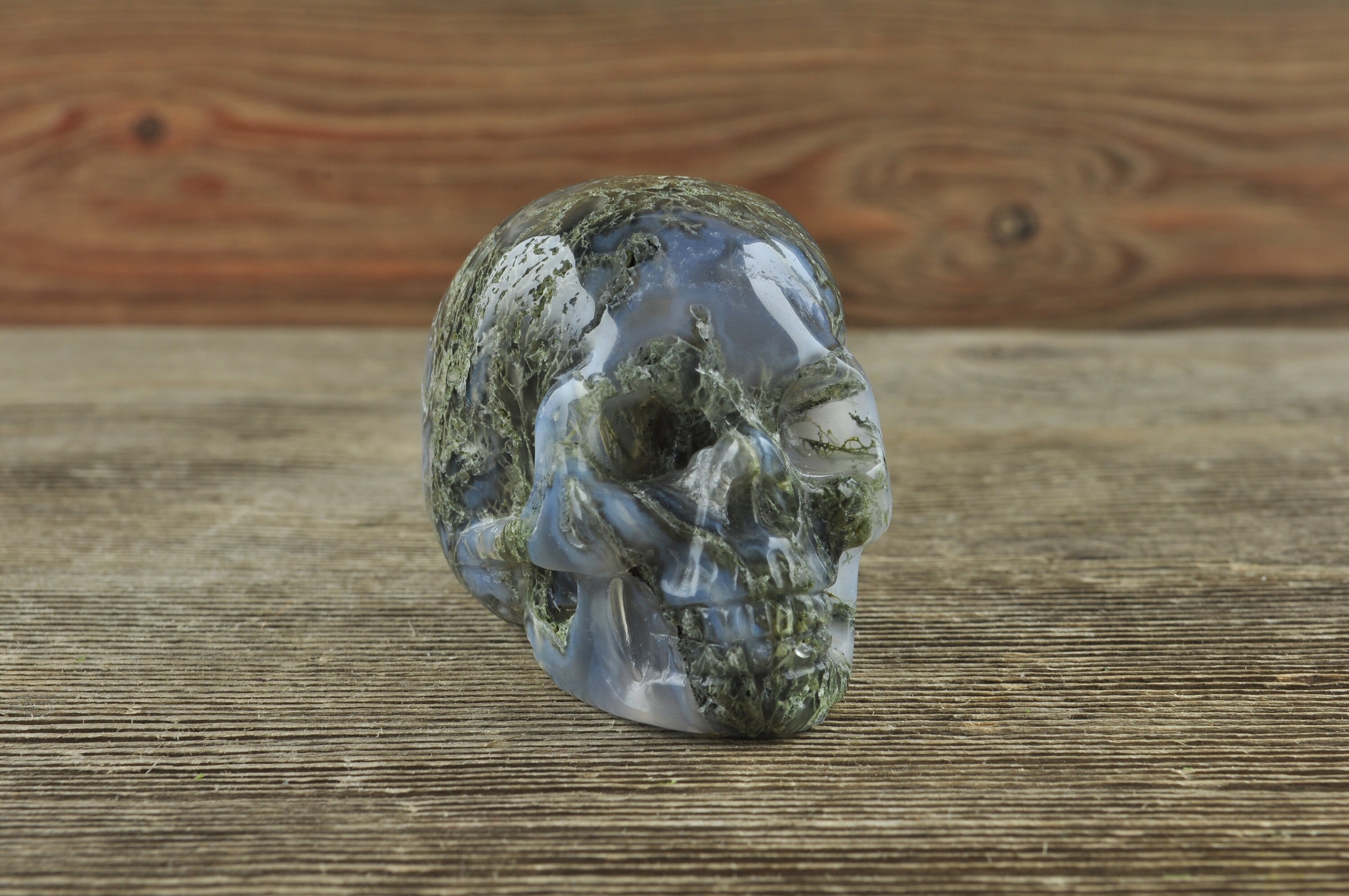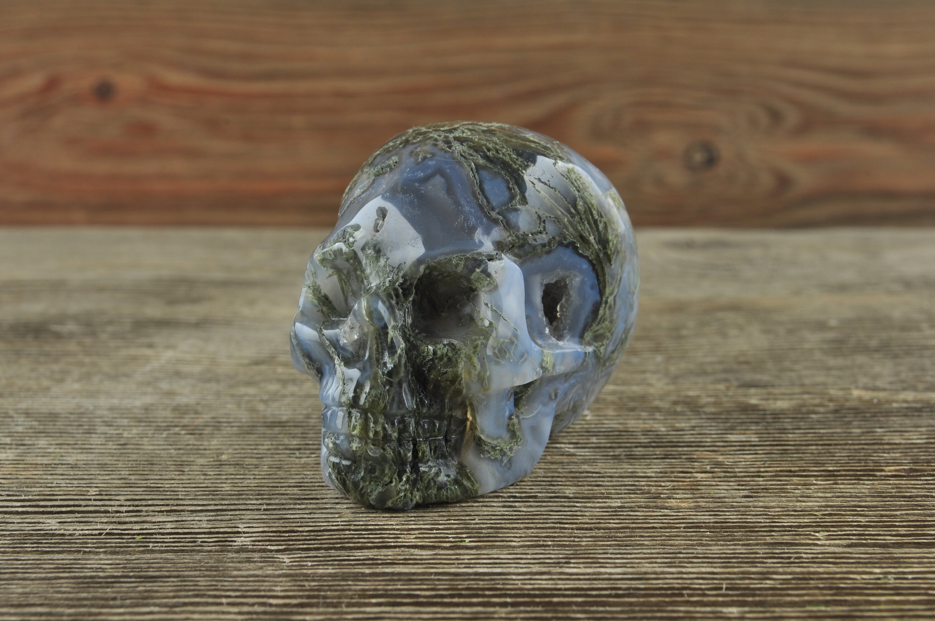 Beautiful, realistic natural Moss Agate and Quartz skull. What a lovely unique skull!!