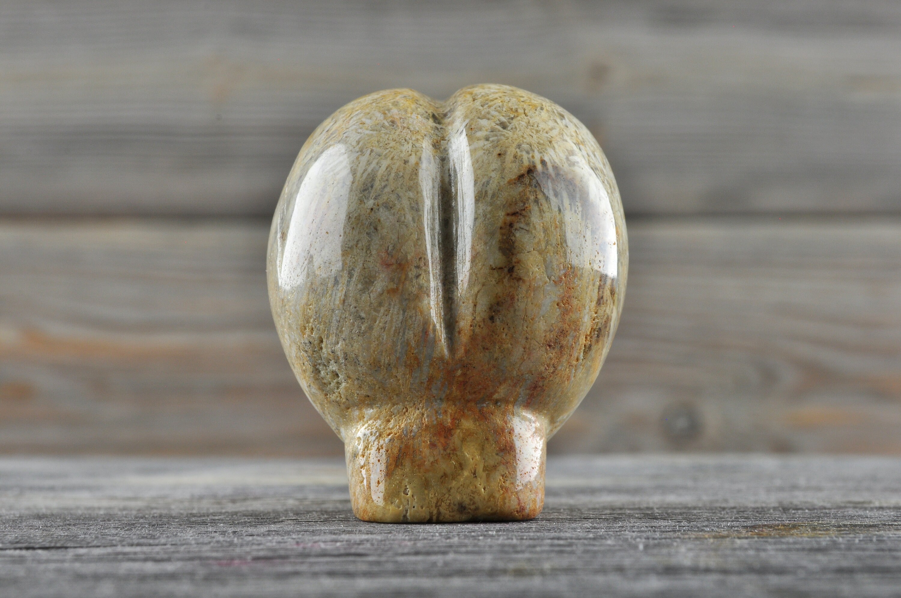 Agatized Coral occurs when silica in the ocean water hardens, replacing the limy corals with a form of quartz mineral known as Agate, a variety of Chalcedony. This long fossilization process (20–30 million years) results in the formation of a "pseudomorph," meaning that one mineral has replaced another without having lost its original form.
