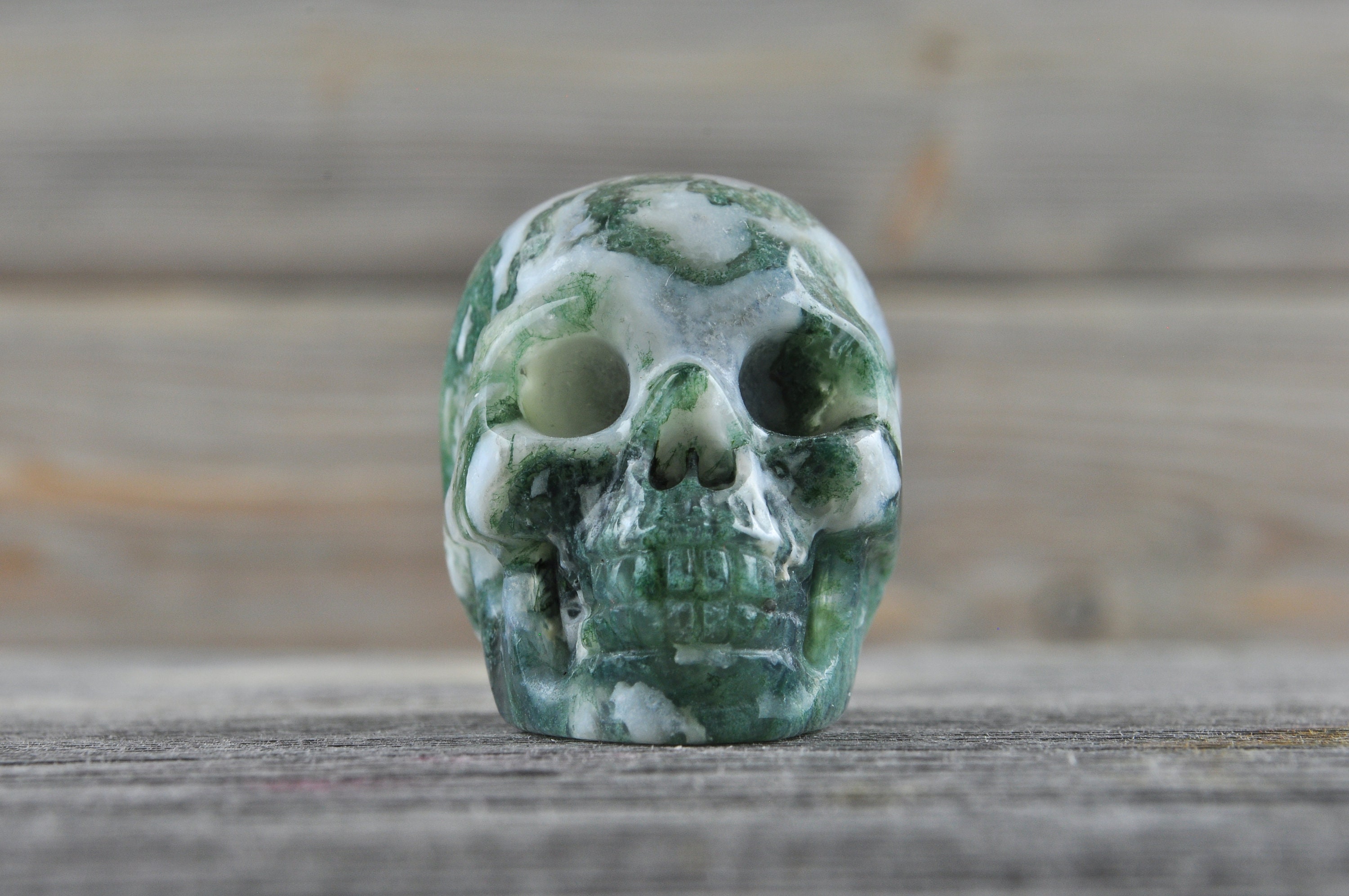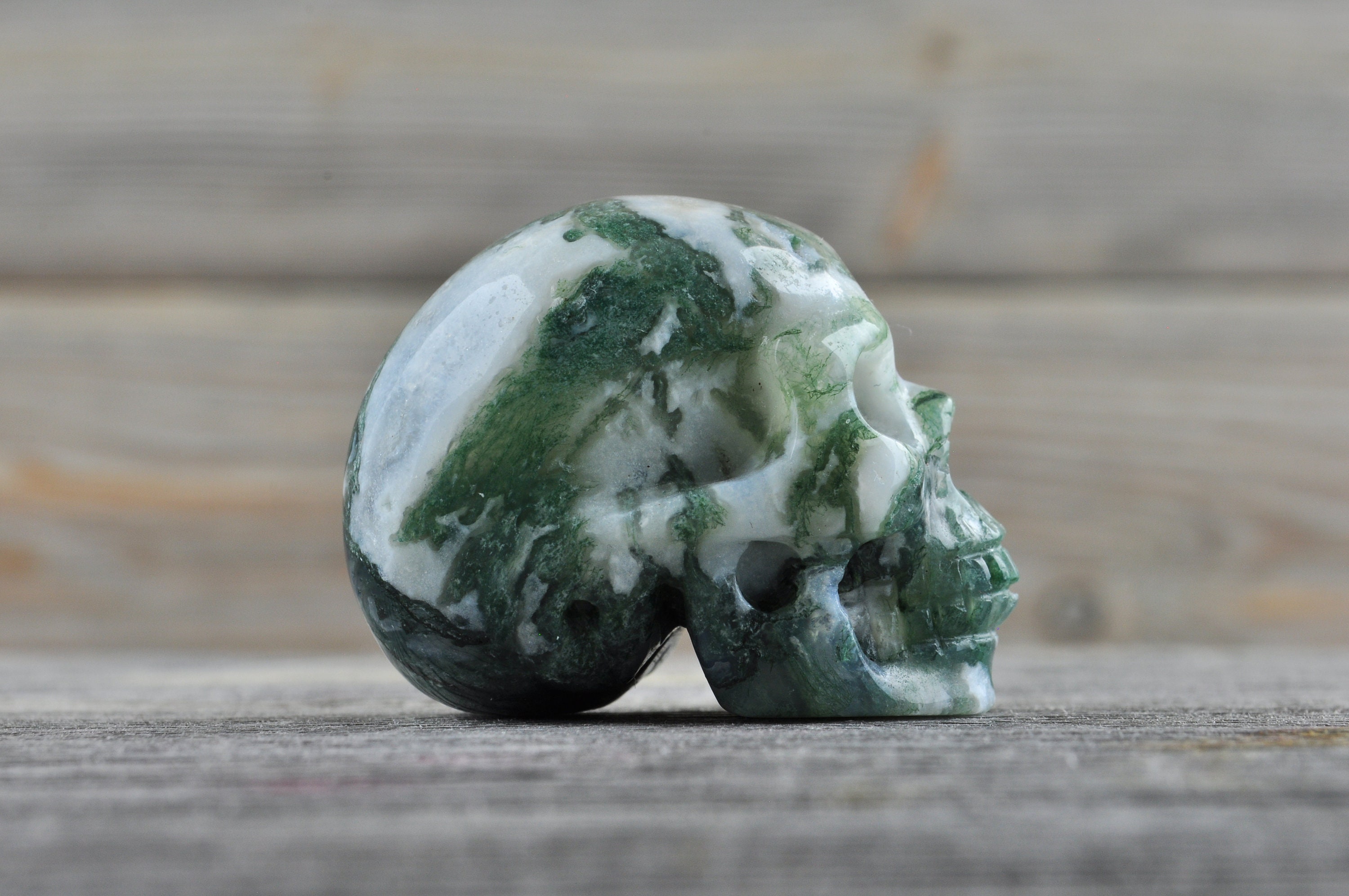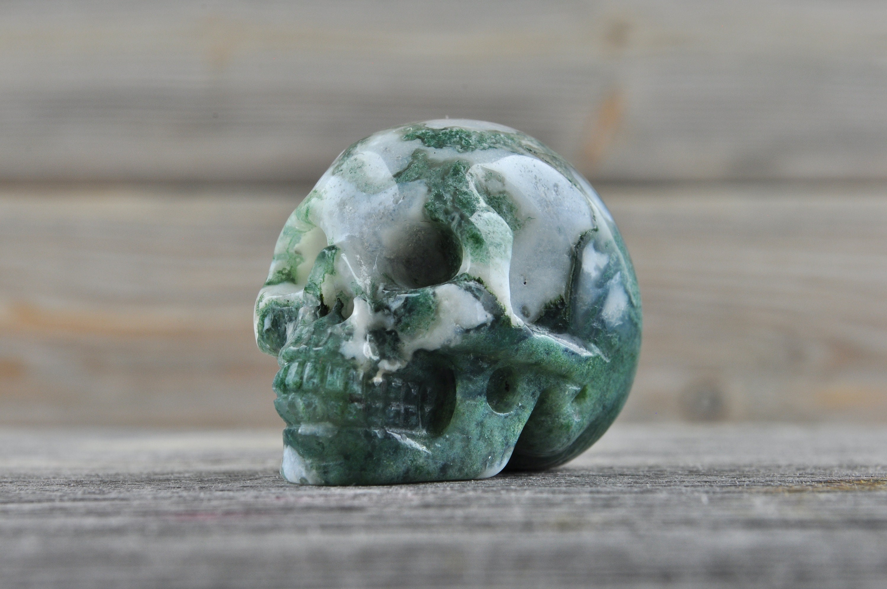 I love my skull! I received my items quickly and they were wrapped very securely. Such great moss agate. He has beautiful detail and is so polished and shiny. Thank you!