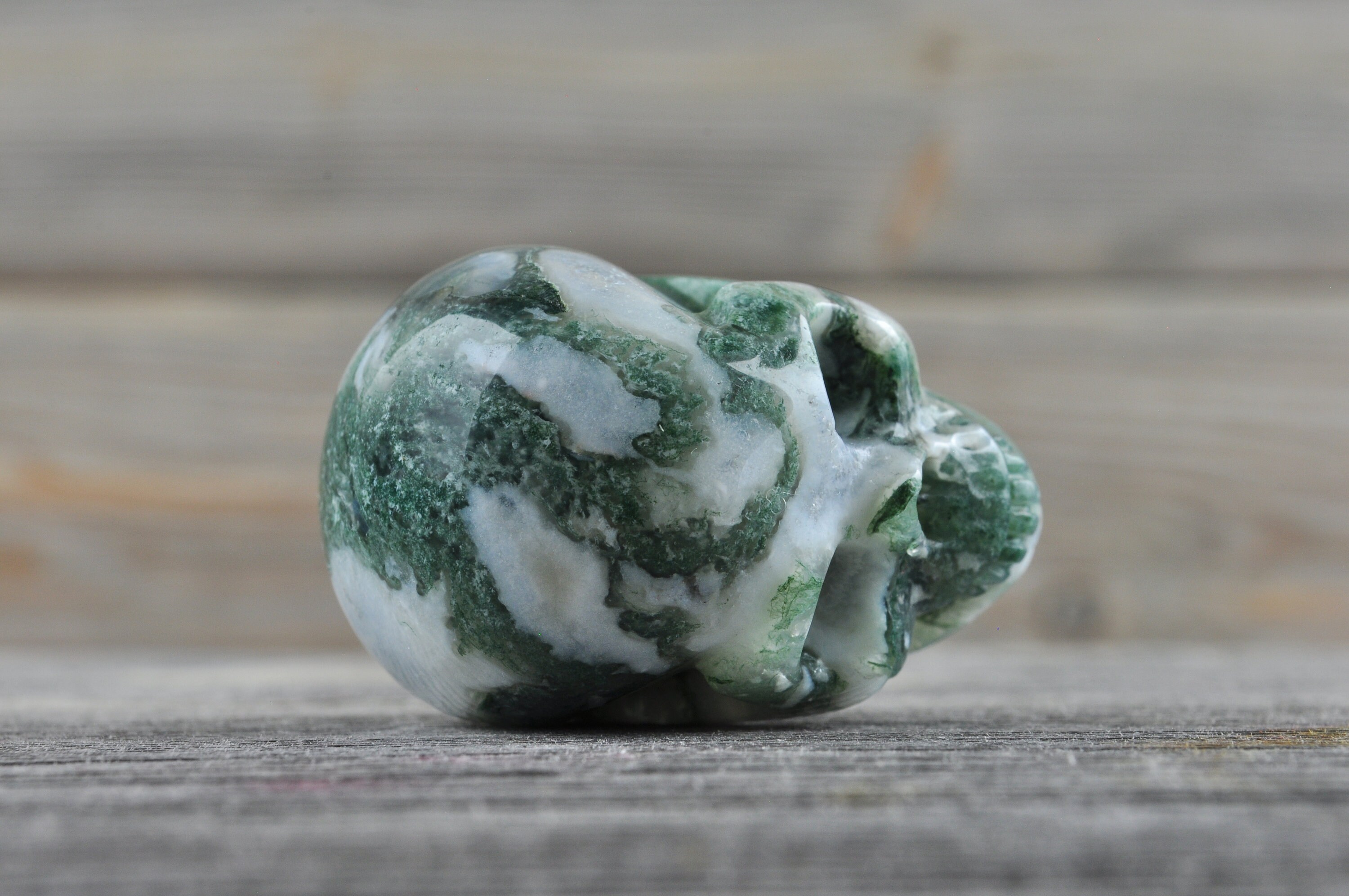 Beautiful, realistic natural, Moss Agate skull.