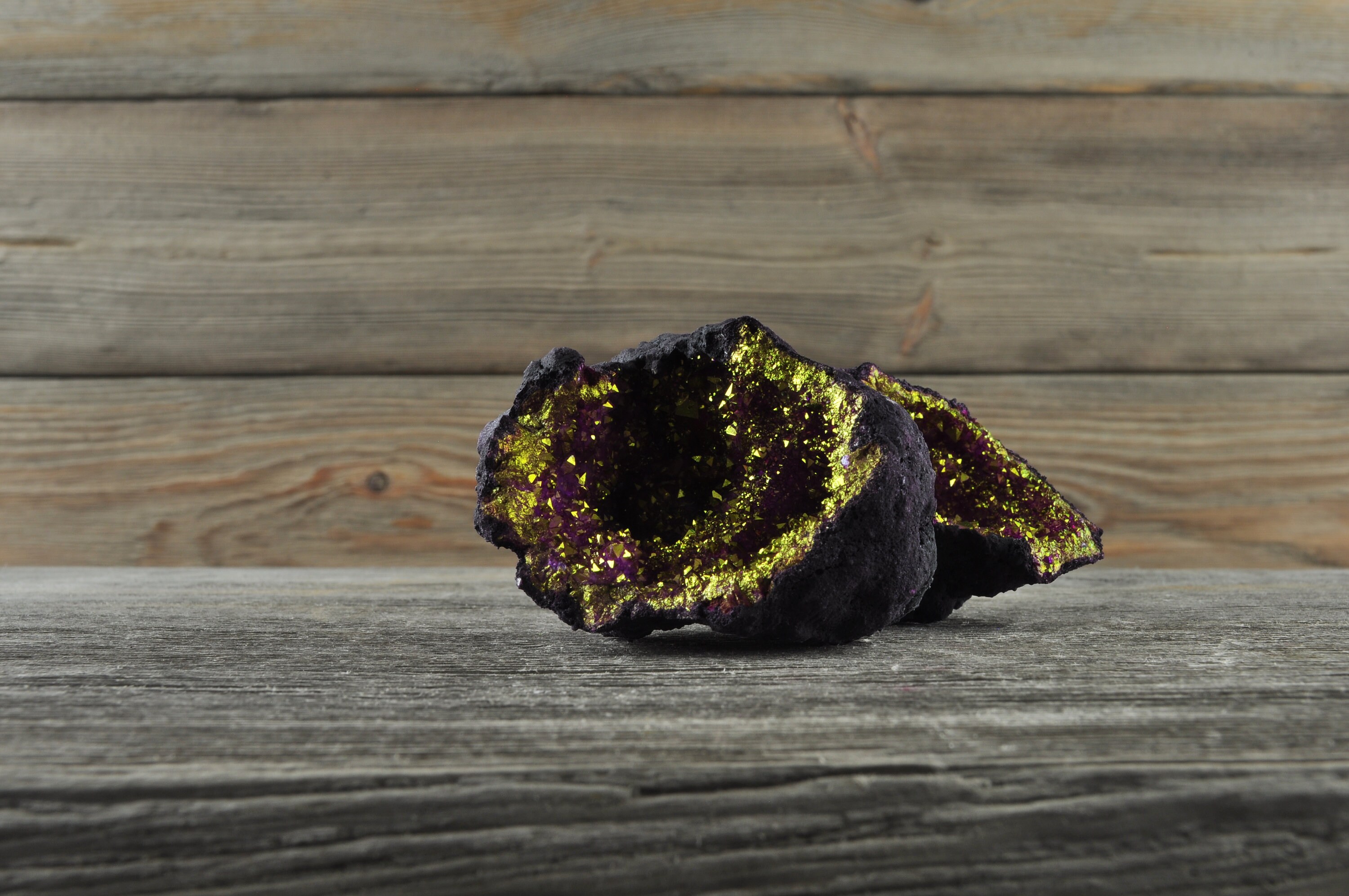 Beautiful Pink, Gold and Black Colored, Moroccan Druzy Geode Halves. These druzy geodes have been colored and halved. These two pieces fit nicely together and the geode in the picture is the EXACT piece you will receive. To maintain coloring, do not moisten geode or put in direct sunlight.