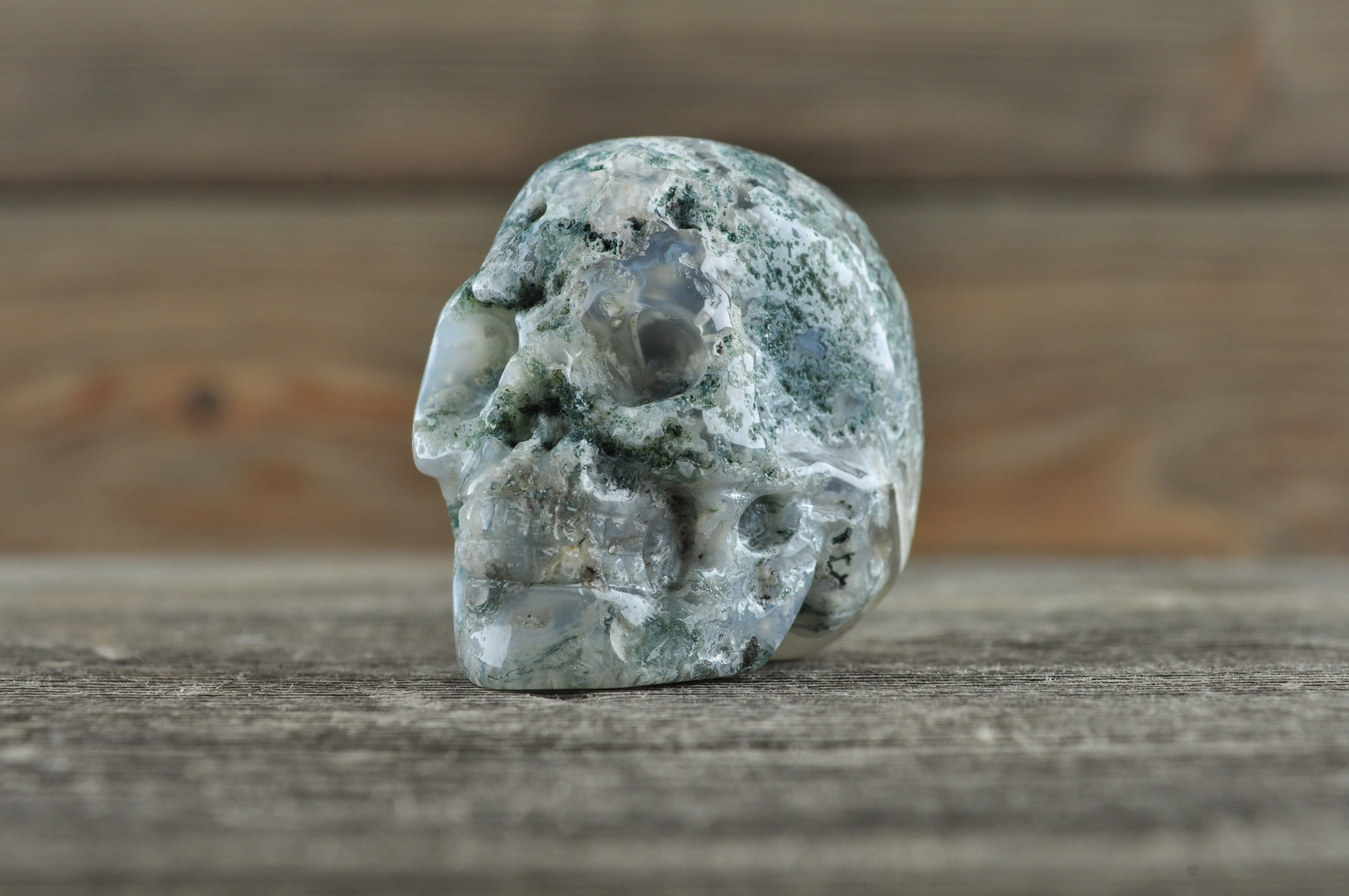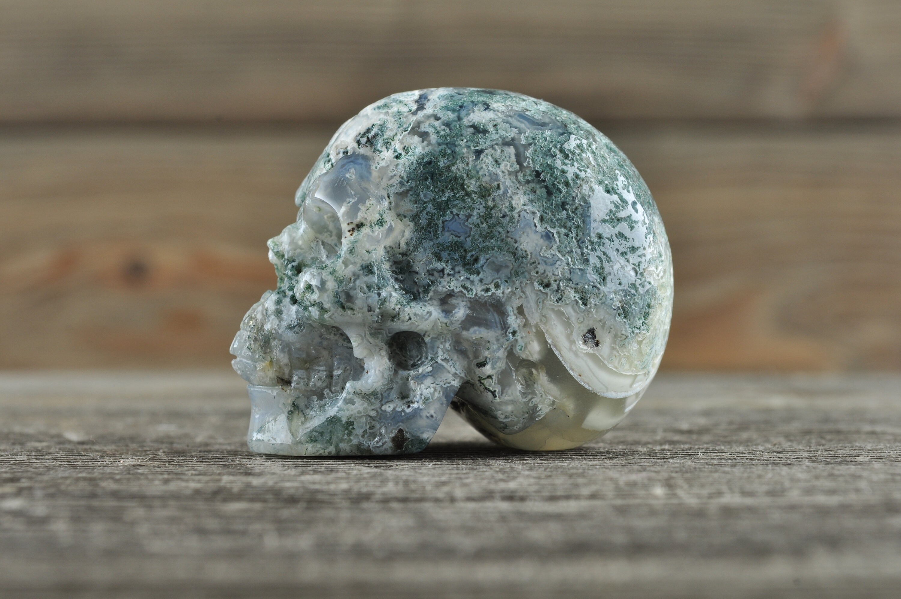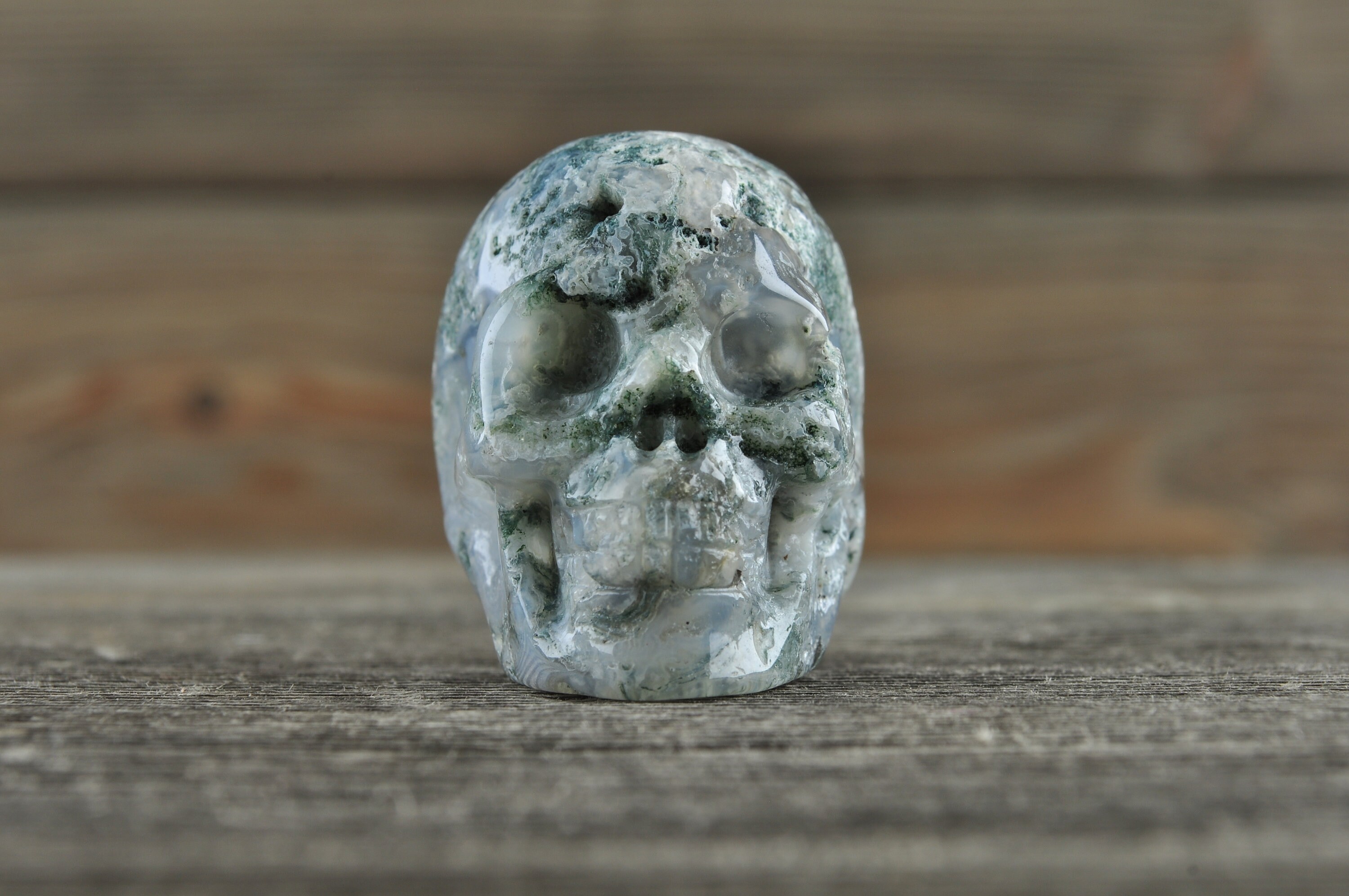 Beautiful, realistic natural, Moss Agate skull with tiny geodes throughout.