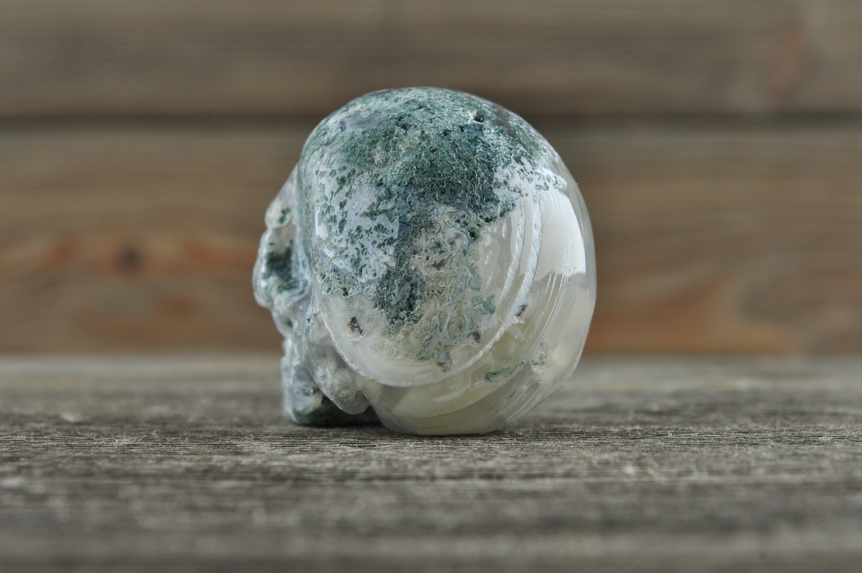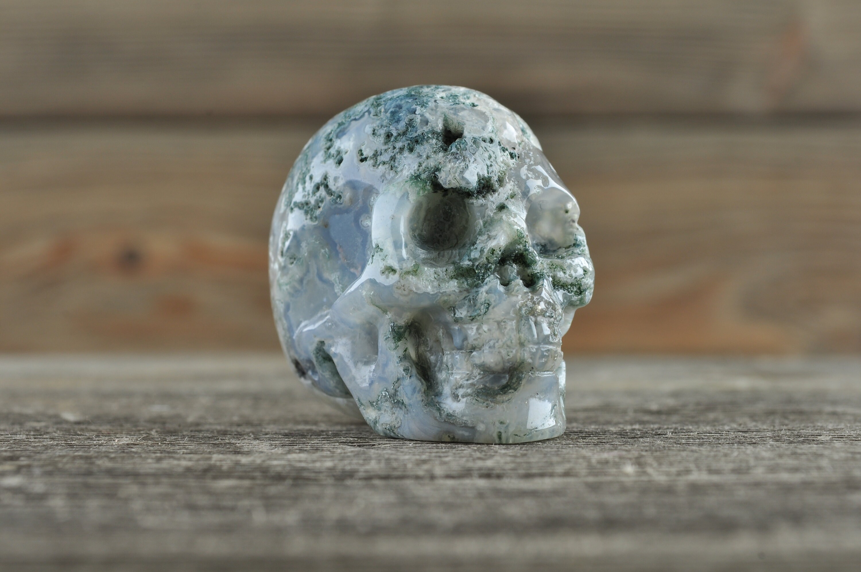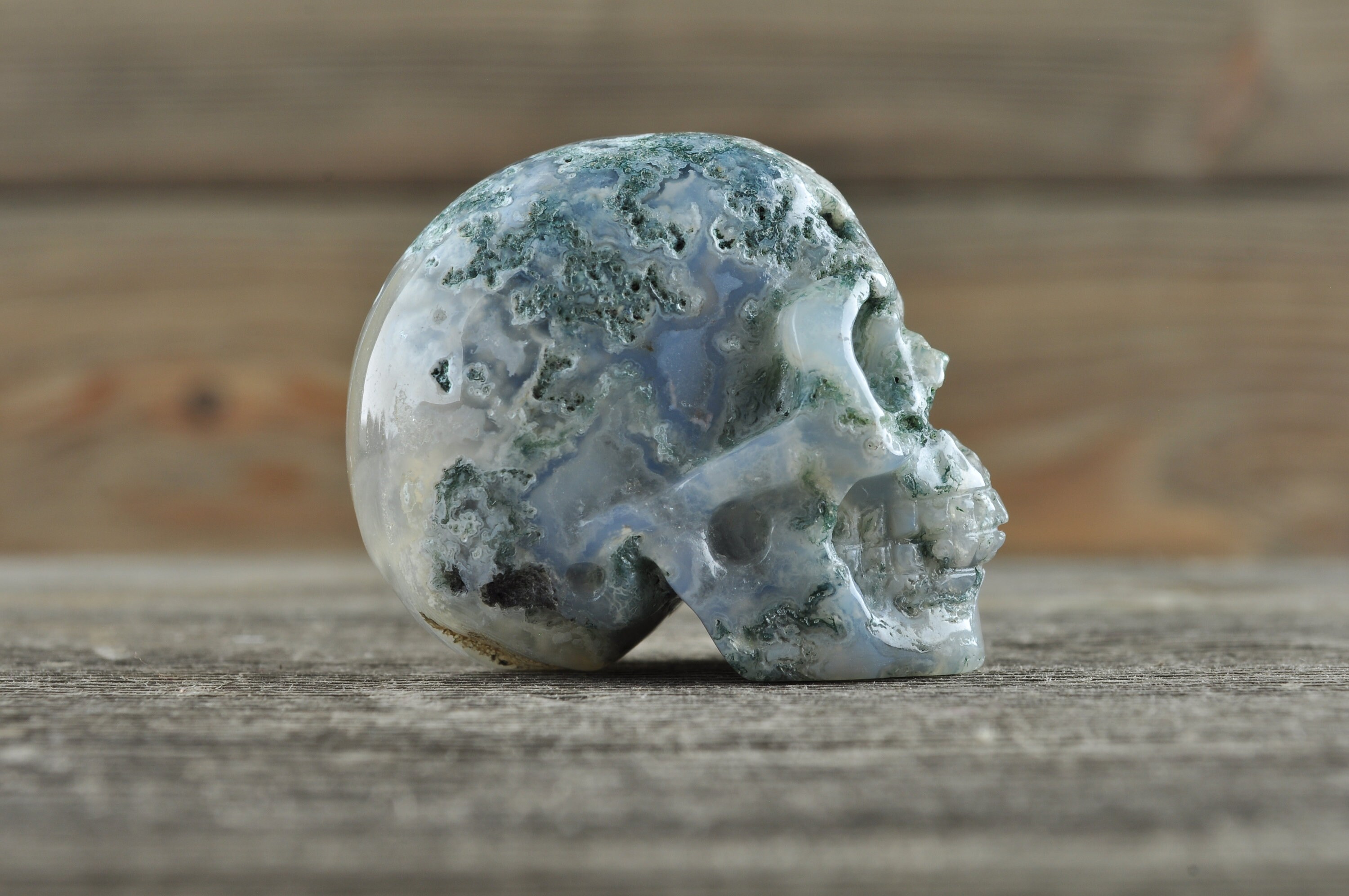 Beautiful, realistic natural, Moss Agate skull with tiny geodes throughout.